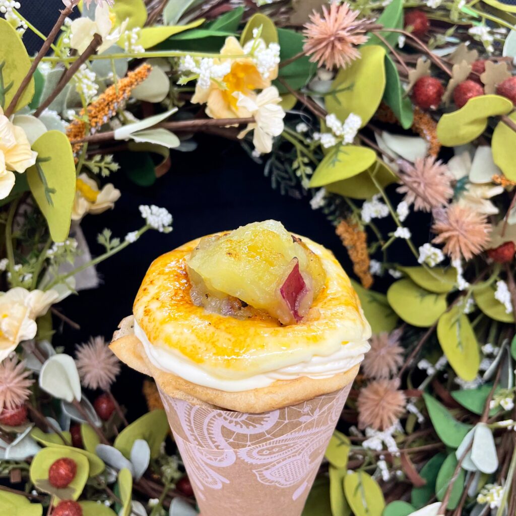 自家製煮りんごとカスタードクリームを包んだら、表面にお砂糖をふりかけてキャラメリゼします。表面がパリパリのうちに召し上がれ。